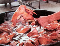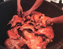 道口義興張燒雞在三百多年的生產(chǎn)實踐中,形成了獨具特色的傳統(tǒng)工藝和配方。它選料嚴格、加工精細、配料合理、安全衛(wèi)生。從原料到成品,要經(jīng)過十多道傳統(tǒng)工序,以多種名貴作料,輔之以循環(huán)使用的陳年老湯精細加工而成。因而具有造型優(yōu)美、型如元寶、豐腴完整;皮色柿紅、微帶嫩黃,色澤鮮艷晶瑩透亮;肉絲有韌勁、雞肉一咬齊茬、香味濃郁、咸淡適口;熟爛離骨,用手一抖,骨肉自行分離;無論涼熱食之,均余香滿口的風味特色,受到各地廣大消費者的稱贊和歡迎。